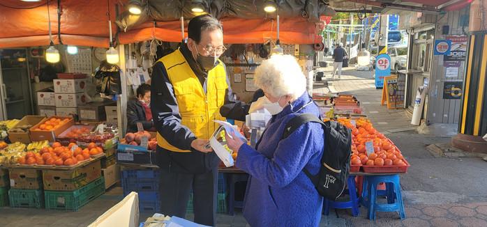 | ▲ 공단 직원들이 폐현수막을 재활용해 만든 장바구니를 용현시장에서 무료로 배부하고 있다. (사진제공=인천 미추홀구 시설관리공단) |