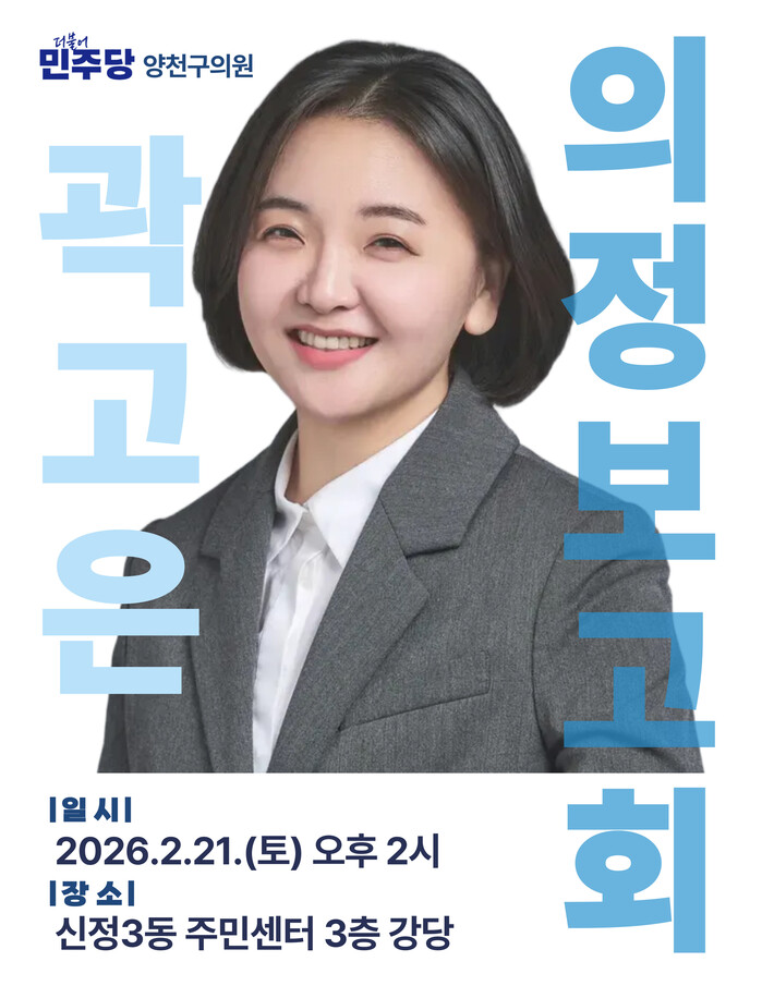 [시민일보 = 박소진 기자] 곽고은 서울 양천구의원이 오는 21일 오후 2시 양천구 신정3동 주민센터에서 의정보고회를 열어 그간의 의정활동 성과와 향후 계획을 양천구민께 보고하는 자리를 마련한다.