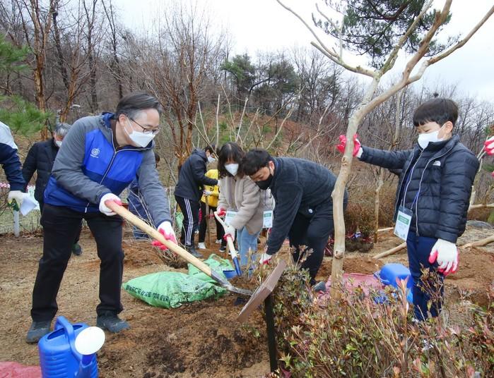 서울 금천구가 제77회 식목일을 맞아 지난 26일 시흥5동 성당 뒤 임야(시흥동 산83-49일대)에서 구민과 함께하는 나무심기 행사를 개최해 목백일홍·칠자화 등 460그루의 나무를 심었다. 사진은 이날 유성훈 구청장(왼쪽)이 가족 단위 주민들과 함께 나무를 심고 있는 모습. (사진제공=금천구청)