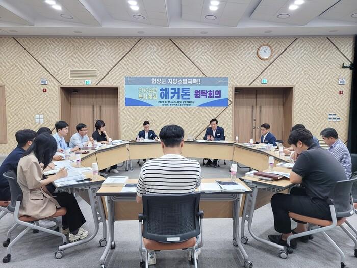 이번 원탁회의는 함양군 지방소멸극복을 위한 투자계획을 마지막 점검하기 위해 군수, 부군수부터 실무자까지 잠시 직위의 고하를 막론하고 오직 성과지향적으로 토의하고자 마련되었다.