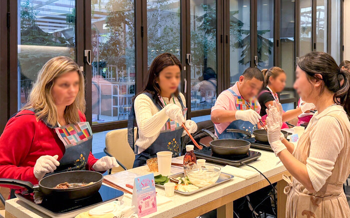 | ▲ 지난 24일 서울 영등포구에 위치한 더현대 서울 6층 문화센터 ‘CH 1985’에서 외국인 환승객들이 전문 강사가 진행하는 한식 쿠킹 클래스를 체험하고 있다. (사진=현대백화점 제공) |