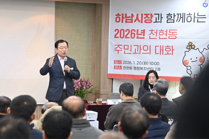 경기 하남시가 지난 20일 천현ㆍ감일동 행정복센터에서 ‘하남시장과 함께하는 2026년 주민과의 대화’를 개최했다. 사진은 천현동 주민과의 대화 행사에 참석한 이현재 시장이 주민들과 대화 나누는 모습. (사진=하남시청 제공)