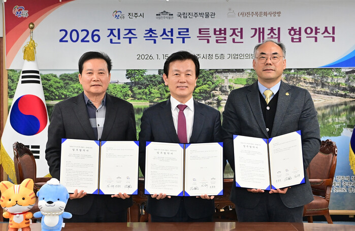 경남 진주시는 15일 국립진주박물관, (사)진주목문화사랑방과 '2026 진주 촉석루 특별전'의 개최를 위한 업무협약(MOU)을 체결했다. 특별전은 오는 4월에 개최될 예정이며, 전시 기간에는 조영제 화백의 유화작품과 방생광 화백의 수묵화 등 촉석루 관련 작품들이 전시된다. 사진은 조규일 시장(가운데)이 관계자들과 협약을 체결한 뒤 기념촬영을 하고 있는 모습. (사진=진주시청 제공)