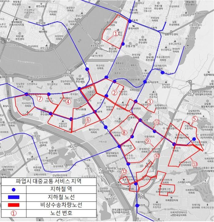 | ▲ 시내버스 파업에 대비하는 송파구의 비상수송차량 운행 노선. (사진제공=송파구청) |