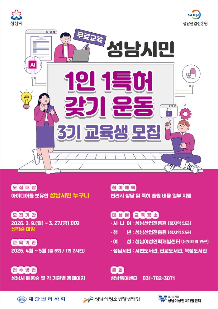 [성남=오왕석 기자] 성남산업진흥원은 시민의 창의적인 아이디어를 지식재산으로 보호하고 창업으로 연결하기 위해 「성남시민 1인 1특허 갖기 운동」 제3기 교육생을 모집한다고 밝혔다.