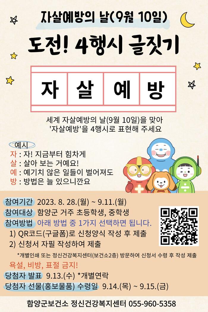 이번 ‘자살예방 4행시 글짓기’ 행사는 자살예방의 날(9월 10일)을 맞아 지역사회 생명존중 문화 조성을 목적으로 실시된다.
