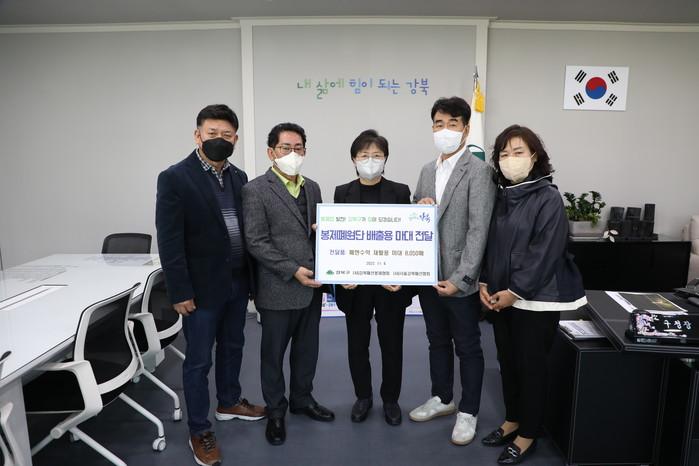 | ▲ 지난 4일 봉제폐원단 배출용 마대 전달식에 참석한 이순희 구청장과 봉제협회 관계자들. (사진제공=강북구청) |