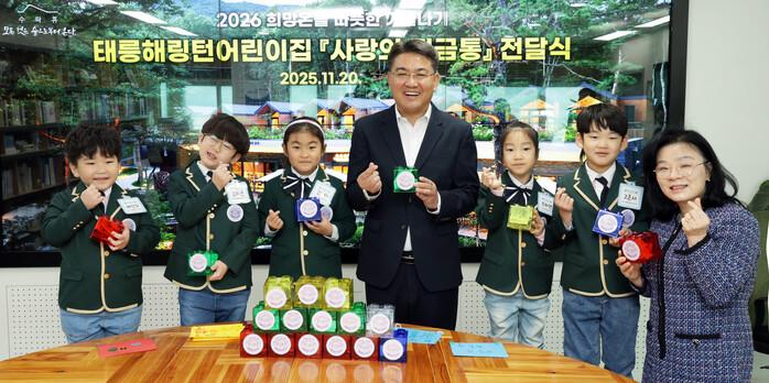 서울 노원구가 최근 오승록 구청장 및 정연모 태릉해링턴어린이집 원장, 담임교사 와 원생 7명 등이 참석한 가운데 구청장실에서 ‘태릉해링턴 어린이집’ 기부금 전달식을 개최했다. 사진은 오 구청장(가운데)이 원아들과 함께 기념 촬영을 하는 모습. (사진=노원구청 제공)