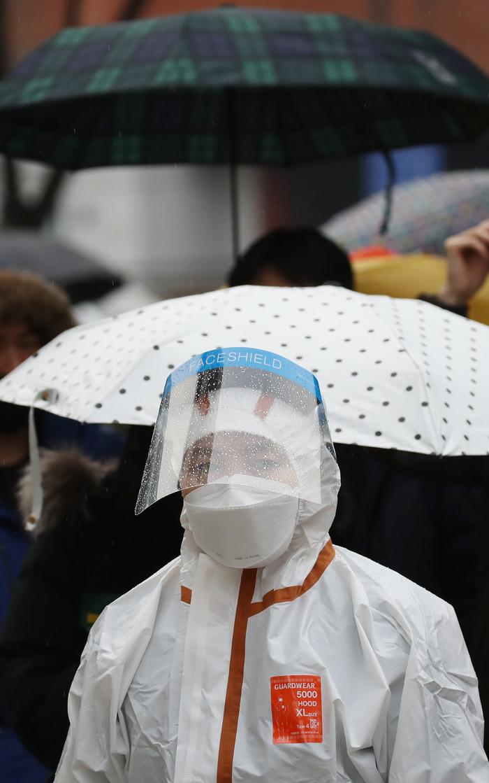국내 신종 코로나바이러스 감염증(코로나19) 신규 확진자 수가 다시 급증하면서 8천명선에 육박하고 위중증 환자도 전날보다 58명이나 늘어난 900명대 후반을 기록한 15일 오전 서울 송파구 보건소 선별진료소에서 의료진이 비를 맞고 있다.