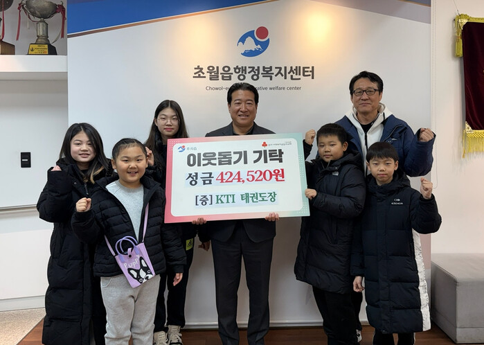 경기 광주시 초월읍 도평리에 위치한 KTI 태권도장은 15일 지역내 취약계층을 돕기 위해 성금 42만4520원을 초월읍에 기탁했다. 사진은 기탁식에서 관계자들이 기념 촬영을 하는 모습. (사진=광주시청 제공)
