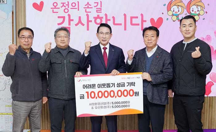 시는 이날 시청 시장실에서 이완섭 서산시장, 한만성 서청환경산업(주) 대표, 안문환 오산환경(주) 대표 등이 참석한 가운데 기탁식을 개최했다.