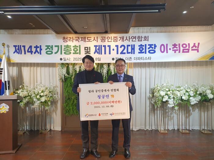 특히 이날 공식 행사 종료 후 별도로 지역 사회 발전과 투명한 부동산 거래 문화 조성에 기여한 유공 공인중개사들에 대한 구청장 표창 수여식 및 청라국제도시공인중개사연합회에서 기부금을 사회복지공동모금회에 기탁하는 전달식을 진행했다.