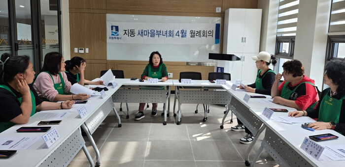 경기 수원시 팔달구 지동은 지난 15일 지동 행정복지센터에서 새마을지도자 부녀회 4월 월례회의를 개최했다. 사진은 월례회의 참석자들이 의견을 나누고 있는 모습. (사진=팔달구청 제공)