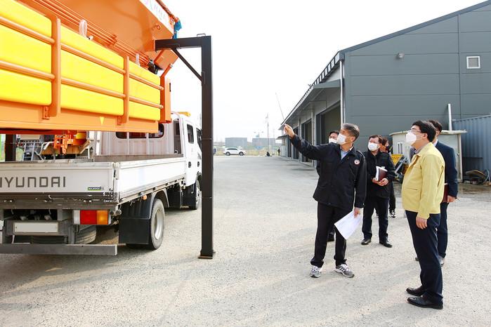 맹정호 충남 서산시장이 19일 서산시도로시설관리소를 방문해 제설자재와 염수교반기, 염수탱크, 살포장비 등의 작동상태를 점검했다. 겨울철 폭설 및 결빙에 신속 대응하기 위한 이날 점검에서는 도로보수원 및 제설임차기사 등 제설작업자 안전교육 실시 현장도 방문해 작업자를 격려하고 준비상황을 살폈다. 사진은 맹 시장(오른쪽)이 현장을 둘러보는 모습. (사진제공=서산시청)