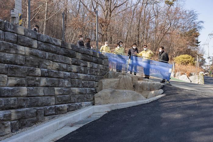 김선갑 서울 광진구청장이 최근 아차산 생태공원 삼거리의 교통체증을 해결하기 위해 실시한 가각정리 공사 현장을 점검했다. 사진은 이날 김 구청장(오른쪽 두 번째)이 현장을 둘러보고 있는 모습. (사진제공=광진구청)