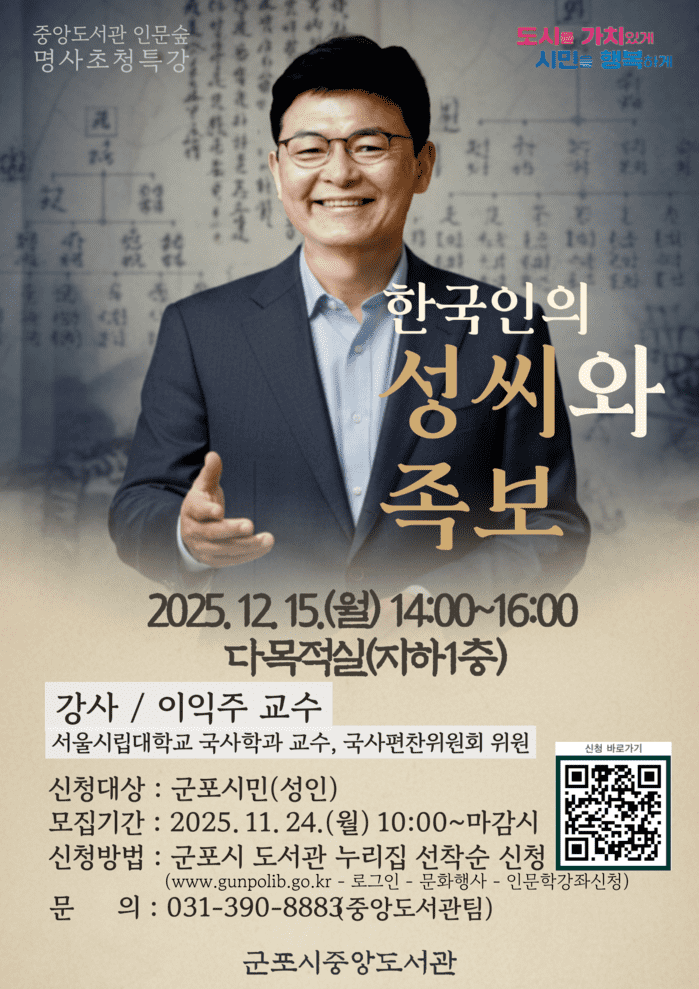 [군포=송윤근 기자] 경기 군포시 중앙도서관이 올 하반기 ‘중앙도서관 인문숲’ 명사 초청 특강의 마지막 무대로 이익주 서울시립대학교 국사학과 교수를 초청해 '한국인의 성씨와 족보' 특강을 진행한다.