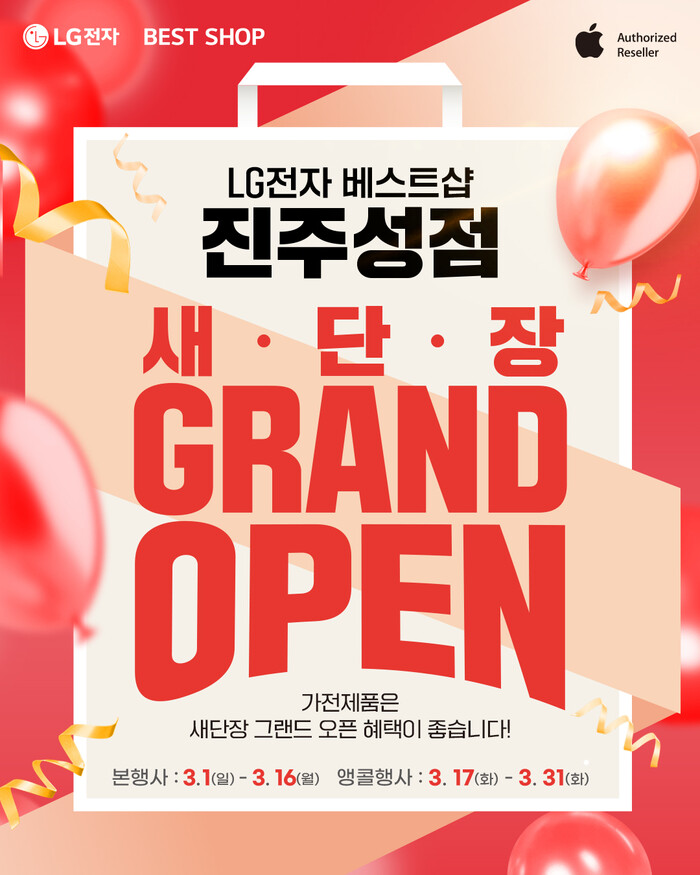 LG전자 베스트샵 진주성점 관계자는 “이번 그랜드 오픈은 단순한 할인 행사가 아니라 구독, 패키지, 사은 혜택을 모두 결합한 종합 프로모션”이라며 “웨딩과 입주를 준비하는 고객들에게 실질적인 구매 기회가 될 것으로 기대한다”고 설명했다.
