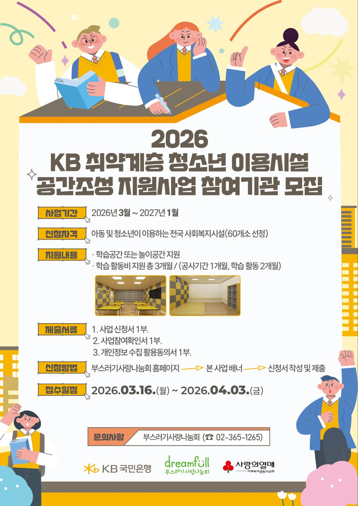 [시민일보 = 박소진 기자] KB국민은행은 청소년의 안전하고 쾌적한 학습환경 조성을 위해 ‘KB청소년센터 리모델링 사업’ 지원 대상 시설 60곳을 모집한다고 밝혔다.