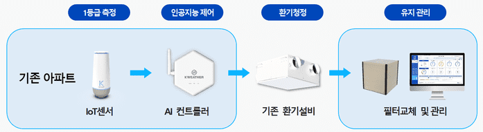 시스템의 원리에 대해 살펴보면, 기존 설치된 환기장치의 운전정보를 AI컨트롤러에 전달하고, AI 컨트롤러는 실내공기질 정보와 환기장치 운전정보를 관리 서버에 전달해 실내공기질에 따른 환기장치의 가동과 환기량을 결정한다.
