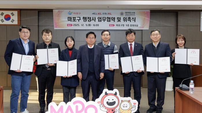 서울 마포구는 9일 마포구청 중회의실에서 ‘마포구 행정사 시범사업 업무협약 및 위촉식’을 개최했다. 이번 업무협약은 무료 행정상담, 상담실 운영 등을 내용으로 한다. 사진은 박강수 구청장(오른쪽 네 번째)과 전문행정사들이 기념촬영을 하고 있는 모습. (사진=마포구청 제공)