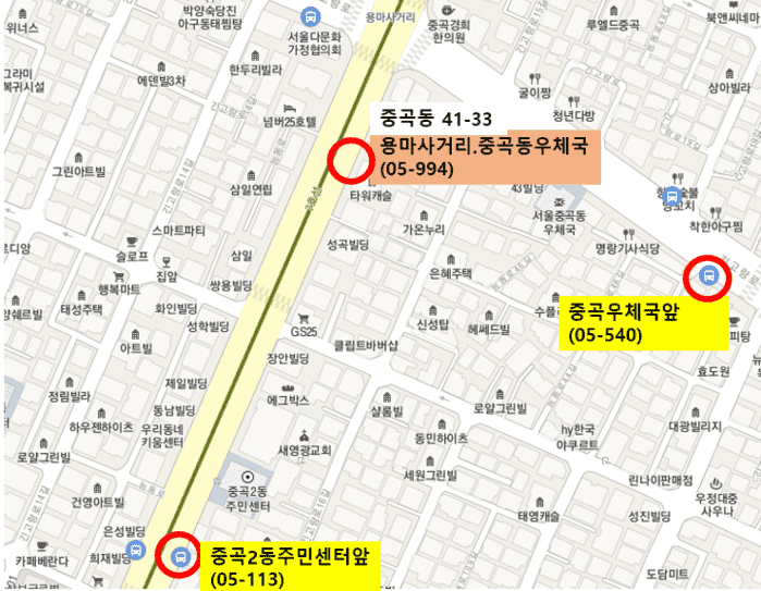 중곡2동 주민센터와 중곡동우체국 앞에 마을버스 정류소를 운영하고 있으나 두 정류소 간 간격이 멀어 이용에 불편함이 있었다.
