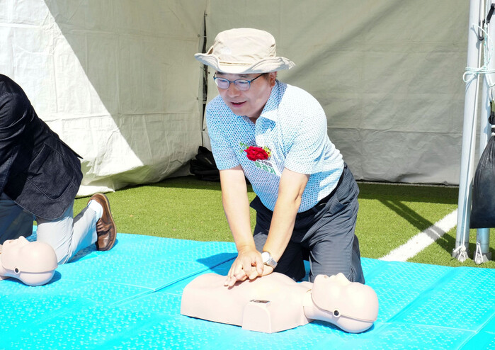 | ▲ 지역안전 역량 강화를 위해 심폐소생술 교육에 참여하고 있는 류경기 중랑구청장. (사진=중랑구청 제공) |
