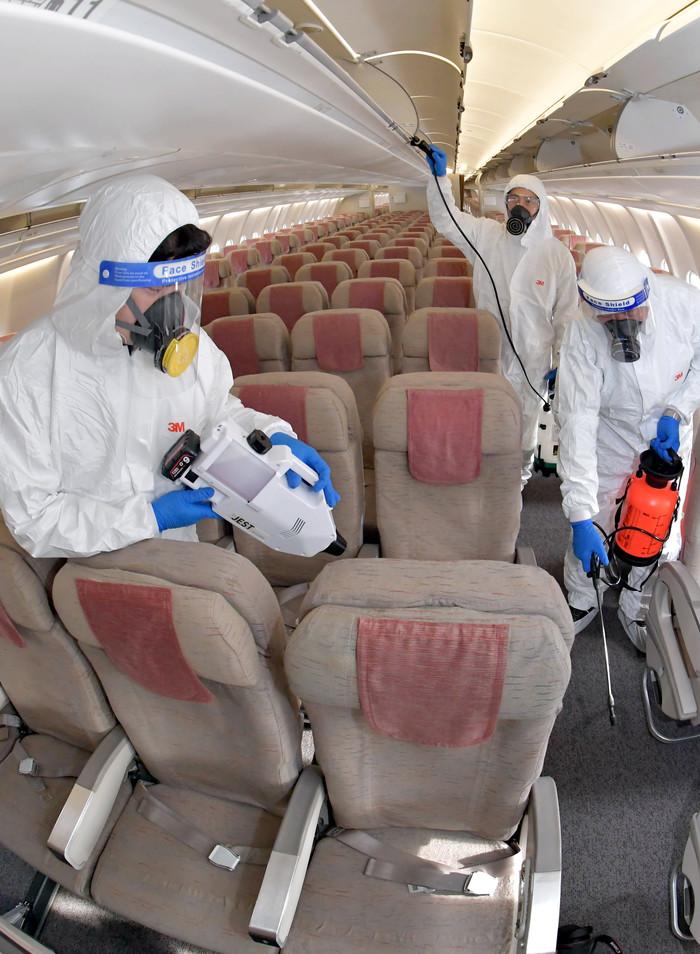 9일 영종도 인천국제공항 아시아나항공 격납고에서 관계자들이 A330 기내 방역소독을 하고 있다.