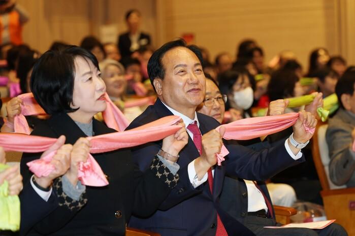 경기 오산시 곳곳에서 따뜻한 손길을 전해 온 자원봉사자들을 격려하는 ‘제24회 자원봉사자 한마음 대축제’가 10일 개최됐다. 사진은 이권재 시장(가운데)이 축제에 참여하고 있는 모습. (사진=오산시청 제공)