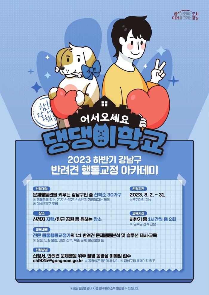 조성명 강남구청장은 “1인 가구, 저출산, 고령화 등 사회 변화에 따라 반려동물 인구가 지속적으로 증가하고 있어, 반려동물 가구에 대한 지원을 강화하고 있다”며 “반려인과 반려견이 다른 이웃들과 공존하며 어우러질 수 있는 강남을 만들기 위해 최선을 다하겠다”고 말했다.