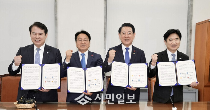 | ▲ 강기정 광주광역시장이 지난 14일 국회 본관에서 열린 광주전남 행정통합 관련 시도지사‧교육감 간담회에 참석해 '광주·전남 대통합 공동 합의문'을 발표한 후 기념촬영을 하고 있다. / 사진 왼쪽부터 이정선 광주시교육감, 강기정 광주광역시장, 김영록 전라남도지사, 김대중 전남도교육감. /광주광역시 제공 |
