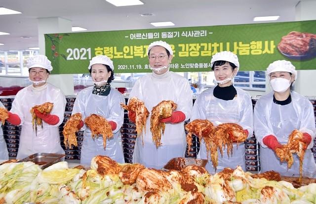 [광주=정찬남 기자] 이용섭 광주광역시장이 19일 오전 북구 효령노인복지타운에서 열린 노인맞춤돌봄서비스 대상자 지원을 위한 '김장김치 나눔행사'에 참석해 자원봉사자들과 함께 담근 김치를 들어보이고 있다./광주광역시 제공