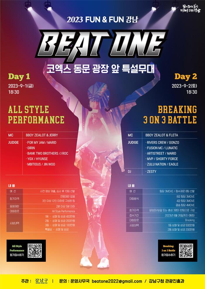 [시민일보 = 이대우 기자] 서울 강남구(구청장 조성명)가 오는 1~2일 오후 6시30분 코엑스 동문 앞 광장에서 댄스 배틀 ‘비트원(Beat one)’을 연다.