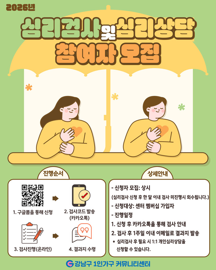 [시민일보 = 이대우 기자] 강남구 1인가구 커뮤니티센터(이하 센터)가 강남구 1인가구의 심리적 안정과 자기돌봄을 돕기 위해 ‘2026년 심리검사 및 심리상담 지원’ 참여자를 모집한다.