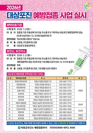 이와 관련한 자세한 사항은 하동군보건소 예방접종 부서로 문의하면 된다.
