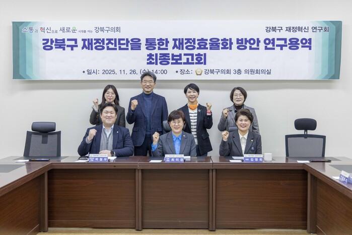 이번 보고회에서는 연구용역 수행기관이 강북구 재정 규모와 지방재정자립도 분석 자료를 기반으로 재정건전성 강화 전략, 재정 효율성 제고 방안, 중장기 정책 방향 등을 제시했다. 또한 서울시 자치구 간 재정 격차가 지속적으로 확대되고 있다는 분석 결과를 함께 공유했으며, 위원들은 해당 원인과 대응 방향에 대해 심도 있게 논의했다.