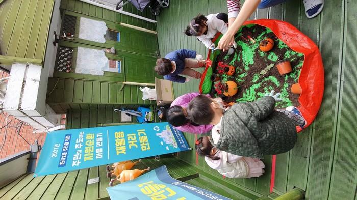 | ▲ 어린이집 아이들이 주민 주도 자원순환 마을 만들기 사업 '재활용 거리 만들기' 활동에 참여하고 있다. (사진제공=강서구청) |