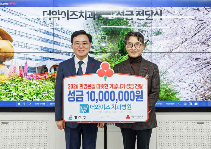 서울 강서구가 최근 화곡동 더와이즈치과병원으로부터 이웃돕기 성금 1000만원을 전달받았다. 전달식은 구청장실에서 진교훈 구청장과 임세웅 대표원장 등 관계자 10여명이 참석한 가운데 진행됐다. 사진은 진교훈 구청장(왼쪽)이 임세웅 더와이즈치과병원 대표원장과 함께 기념촬영을 하는 모습. (사진=강서구청 제공)