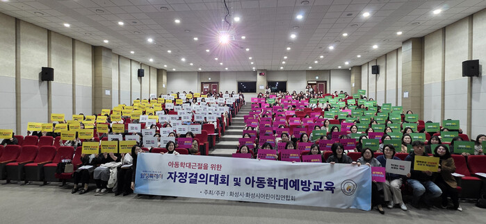 교육에 앞서 화성시어린이집연합회(회장 김미아)는 아동학대 근절을 위한 자정 결의대회를 개최했다. 보육 교직원들이 직접 아동학대 근절을 다짐하는 모습은 이번 교육이 단순한 의무 이수가 아닌, 현장의 자발적 변화를 이끌어내는 자리였음을 보여줬다.