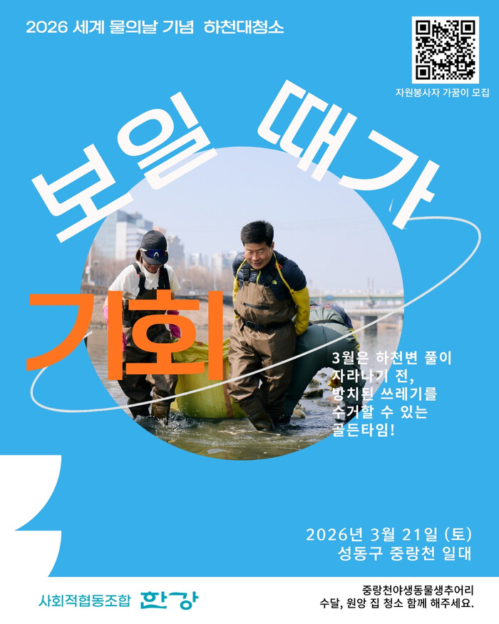[시민일보 = 박소진 기자] 서울 성동구와 사회적협동조합 한강은 세계 물의 날(3월22일)을 맞아 오는 21일 오전 10시부터 오후 1시까지 성동구 중랑천 일대에서 하천 대청소 자원봉사 활동을 진행한다고 밝혔다.