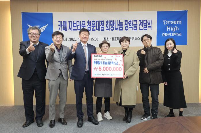 이번 장학금은 청운대학교 학생들이 주로 이용하는 카페지브라운 청운대점의 수익 일부를 지역사회에 환원하고, 학생들의 학업을 지원하기 위해 마련됐다.