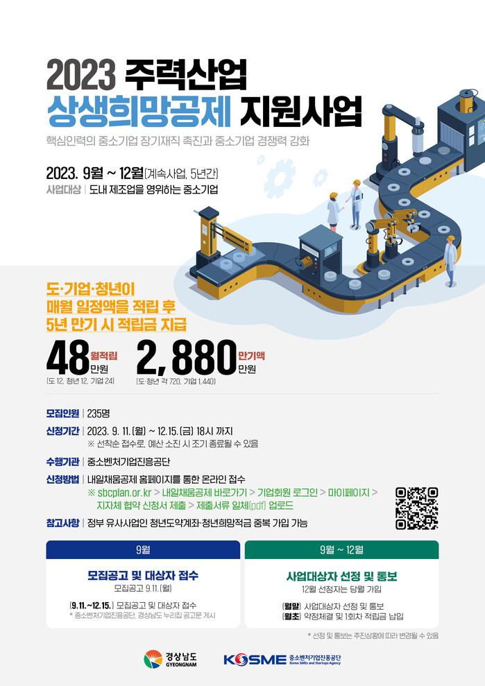 [창원=김점영 기자] 경남도가 지역산업 육성과 청년 고용안정 지원을 위해, ‘2023년 주력산업 상생희망공제’ 참여기업과 청년을 추가 모집한다고 밝혔다.