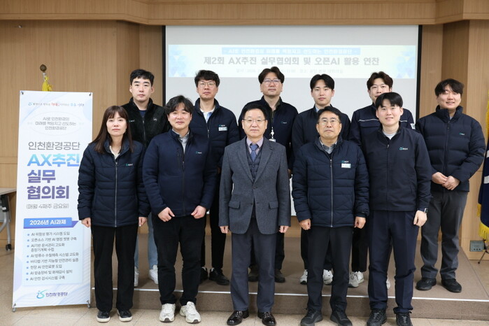 | 인천환경공단 ‘제2차 AX 추진 실무협의회 및 오픈 AI 활용 연찬회’ 참가자들이 포즈를 취하고 있다. [사진=인천환경공단] |