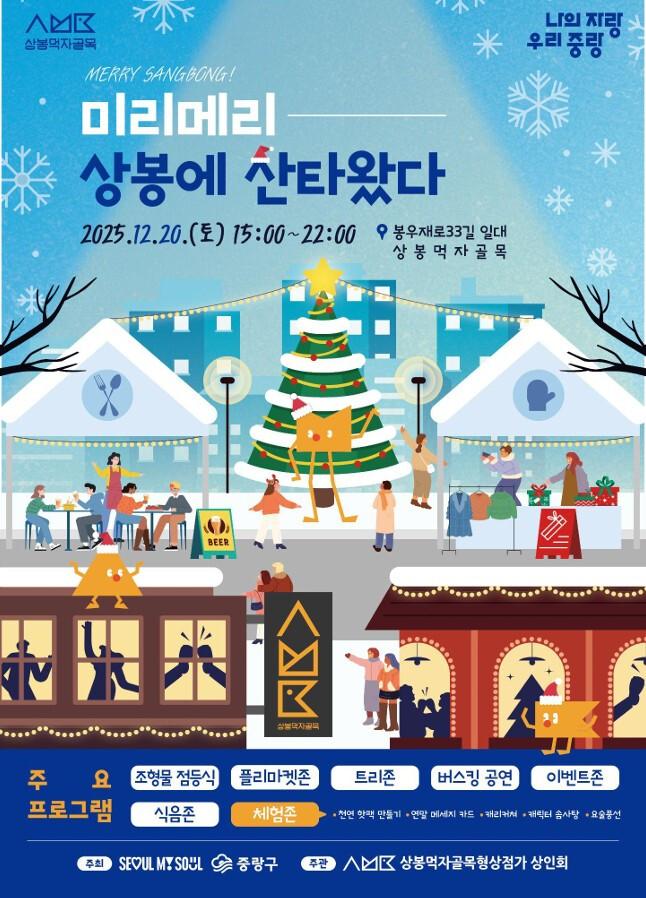 제2호 상봉먹자 골목형상점가는 젊은 세대를 중심으로 많은 방문객이 찾는 중랑구 대표 골목상권으로, 이번 축제는 크리스마스의 설렘과 겨울 정취를 담은 주민 참여형 행사로 진행된다.