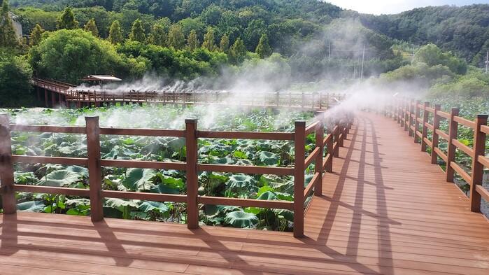 24일 합천군에 따르면 군은 지구온난화로 인해 무더위가 지속되고 있어 정양늪 생태공원을 방문하는 탐방객에게 쾌적한 환경을 제공하기 위해 정양늪 목재데크에 쿨링포그 시스템을 설치했다.