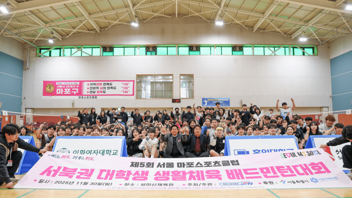 박강수 서울 마포구청장은 최근 성미산체육관에서 열린 ‘2025 서북권 대학생 배드민턴 대회’에 참석해 참가자들을 격려했다. 사진은 박 구청장과 관계자들이 기념촬영을 하고 있는 모습. (사진=마포구청 제공)