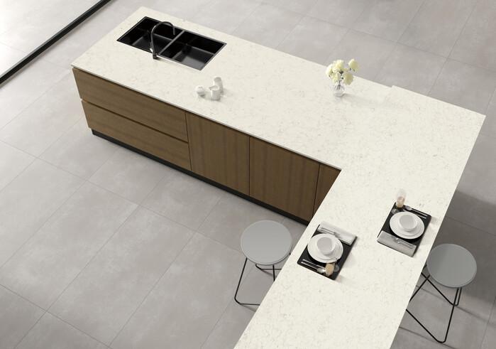 또한 패턴이 끊이지 않고 자연스러운 대형 마감재를 선호하는 인테리어 고급화 트렌드에 맞춰 센스톤 쿼츠는 가로 1600mm, 세로 3200mm, 두께 20mm의 대형 규격으로 출시됐다. 이를 통해 주방 상판은 물론 상판과 측면이 하나로 이어지는 일체감 있는 시공도 가능해 웅장하고 고급스러운 아일랜드형 주방 연출이 가능하다.