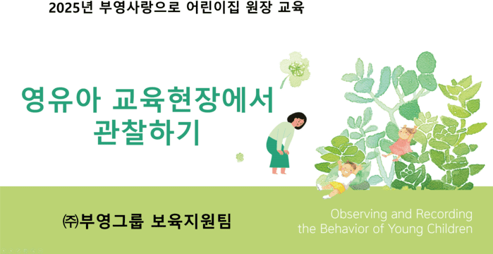 이번 교육은 원장이 먼저 교육을 받은 후 교사들에게 전달 연수를 실시하고 현장 적용을 강화한 것이 특징이다. 그뿐 아니라 부영 사랑으로 어린이집 원장들이 향후 ‘관찰 교육 강사’로 성장하도록 지원하는 데 목적이 있다. 교육은 총 5개월에 걸쳐 진행되며, 동영상 강의와 온라인 실시간 연수 방식을 병행한다.