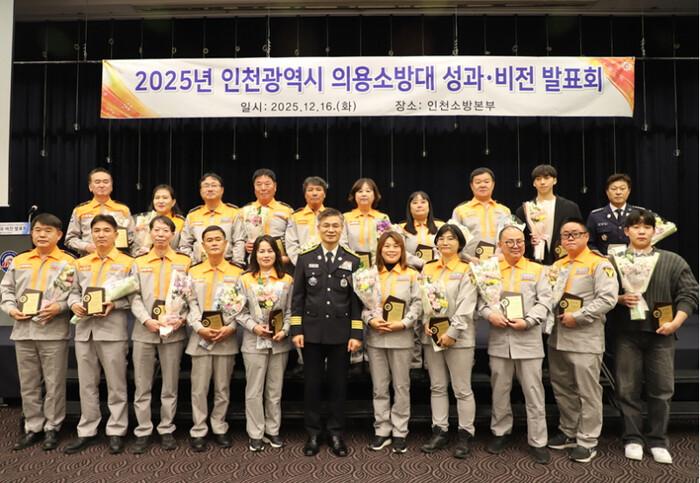| ‘2025년 의용소방대 성과 비전 발표회’참가자들이 기념 촬영을 하고 있다. [사진=인천소방본부] |