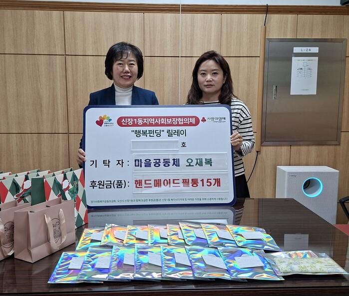 경기 오산시 신장1동 행정복지센터가 최근 마을공동체 ‘오재복’으로부터 지역내 취약계층 아동·청소년을 위한 핸드메이드 필통 15개를 기부받았다. 사진은 전달식에서 관계자들이 기념 촬영을 하고 있는 모습. (사진=오산시청 제공)
