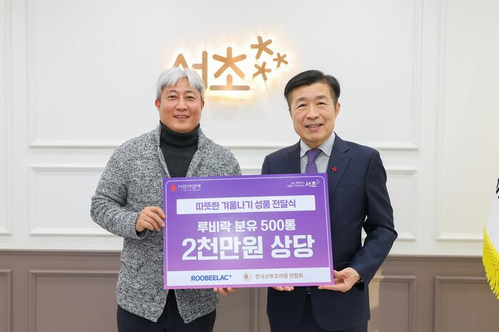 | ▲ 전성수 구청장(오른쪽)과 이석범 한국산후조리원연합회 대표(왼쪽)가 따뜻한 겨울나기 이웃돕기 전달식에서 기념촬영을 하고 있다. (사진=서초구청 제공) |